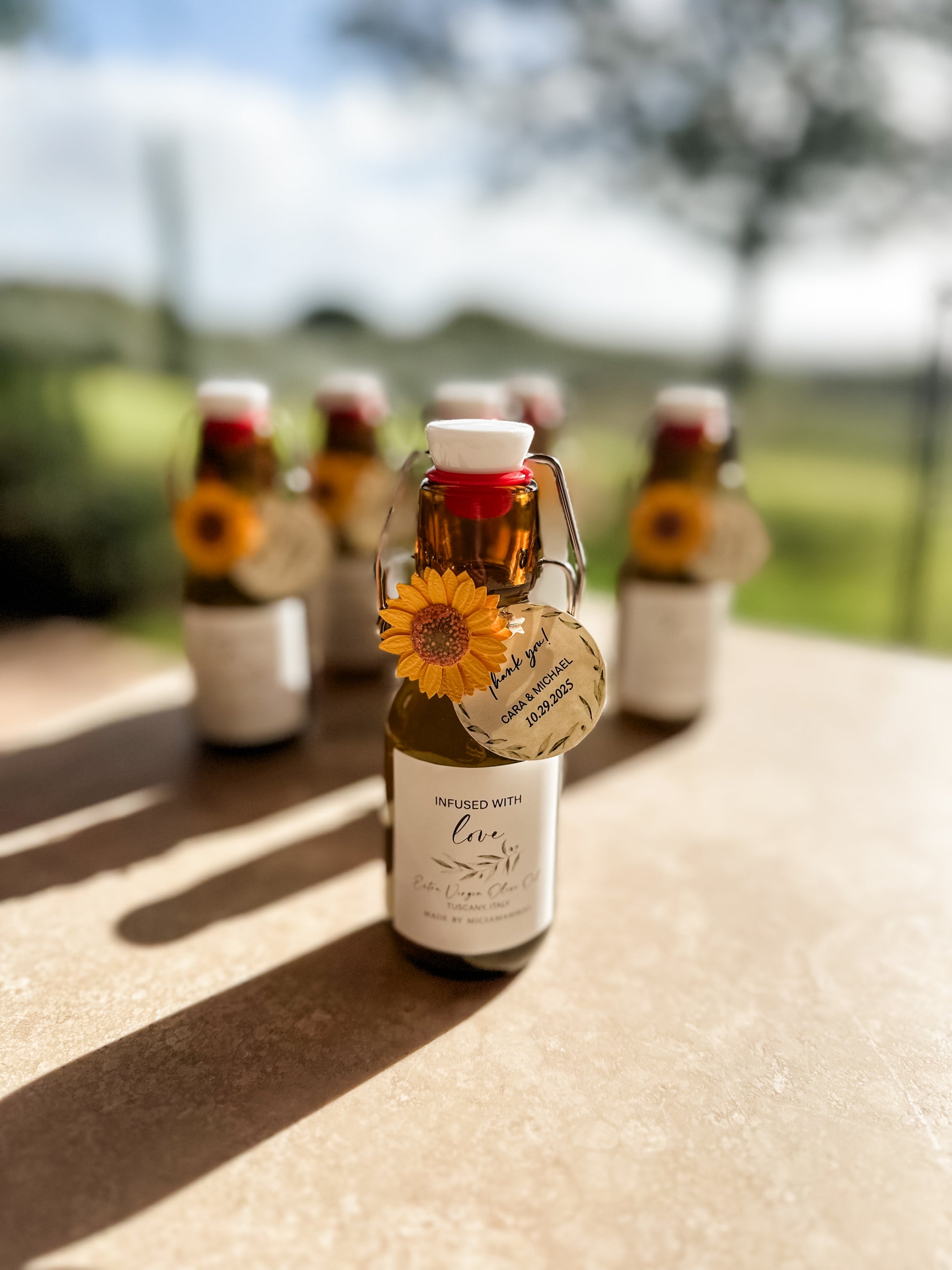 Introducing our exquisite Olive Oil Party Favors (Set of 20), beautifully presented 4-ounce bottle of authentic olive oil from my home in Tuscany. Each bottle is carefully wrapped to perfection, making it a charming addition to your special day. Personalize your favor with custom labels that reflect your unique style and the occasion you’re celebrating. With a lead time of just three weeks, you can easily add this delightful touch to your special occasion, offering your guests a taste of Tuscany's rich heritage. Elevate your celebration with this elegant and meaningful gift that resonates with warmth and tradition.